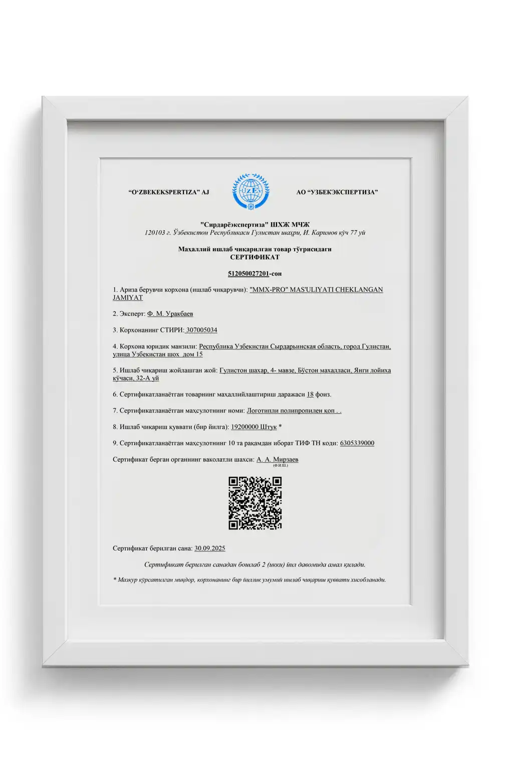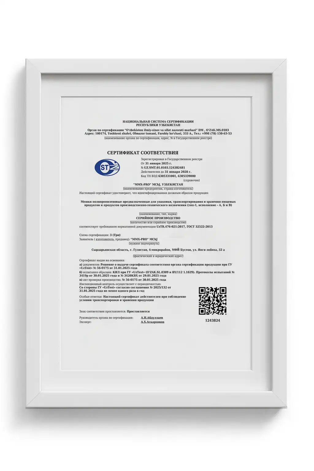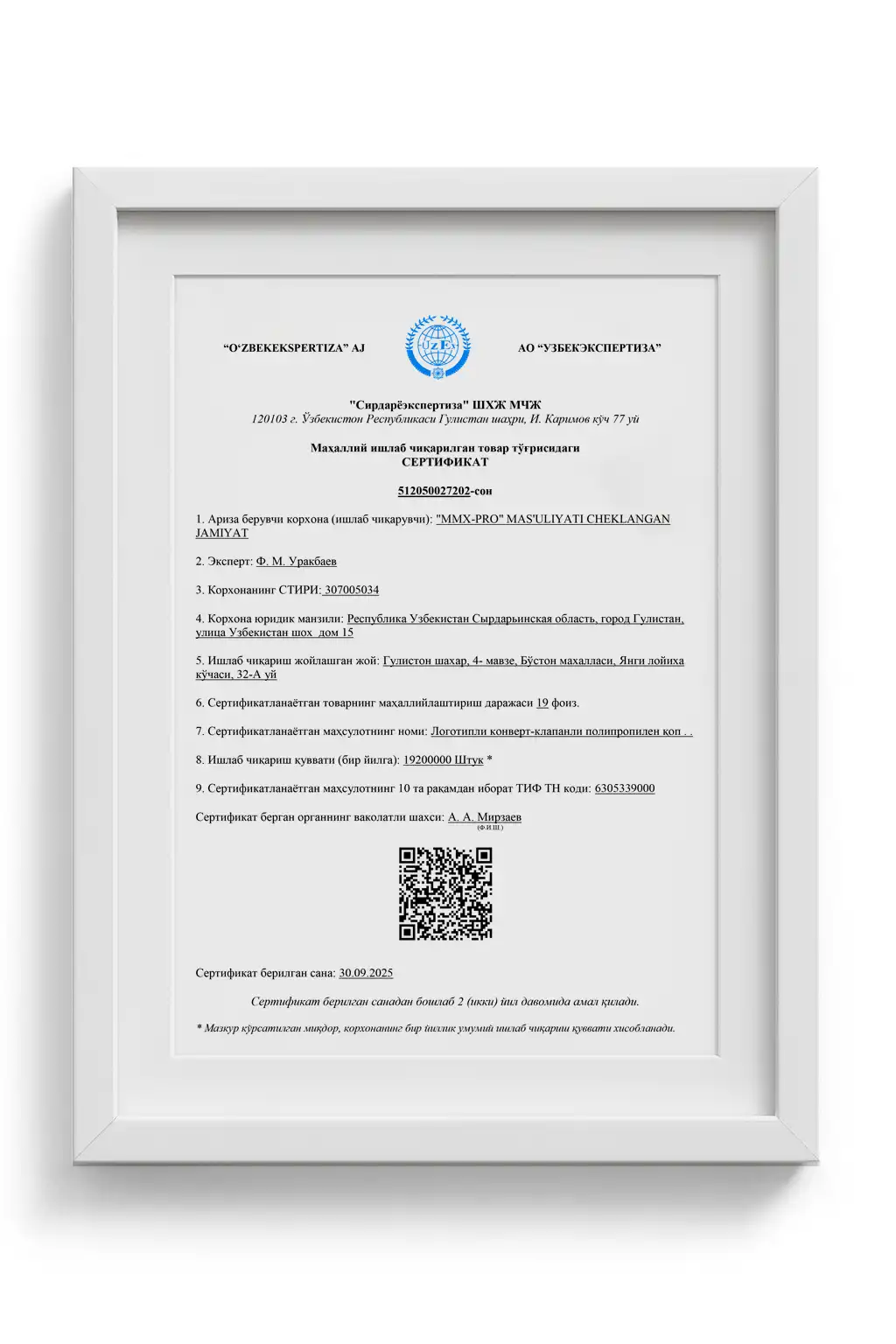 31 января 2025 года компания получила Сертификат соответствия № UZ.SMT.01.0103.124382481, действующий до 2028 года. Он подтверждает, что полипропиленовые мешки MMX PRO предназначены для упаковки, транспортировки и хранения пищевых и промышленных продуктов, соответствуя стандартам UzTR.476-021:2017 и ГОСТ 32522-2013.